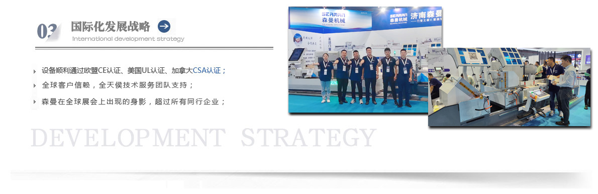 “森曼機(jī)械”作為全球門(mén)窗設(shè)備供應(yīng)商,本著"seaman"精神,勇立潮頭,拼搏創(chuàng)新,以爭(zhēng)做行業(yè)為目標(biāo),在行業(yè)前輩發(fā)展的基礎(chǔ)上,努力學(xué)習(xí),積極進(jìn)取。目前公司產(chǎn)品涵蓋塑料門(mén)窗設(shè)備、鋁合金門(mén)窗設(shè)備、鋁幕墻設(shè)備、鋁木復(fù)合門(mén)窗設(shè)備及中空玻璃設(shè)備五大種類(lèi),近百個(gè)品種。公司產(chǎn)品銷(xiāo)售至全國(guó)各地及東南亞、非洲、東歐、北美等幾十個(gè)國(guó)家和地區(qū)。在這個(gè)競(jìng)爭(zhēng)激烈的年代,我們正努力使我們的產(chǎn)品!
